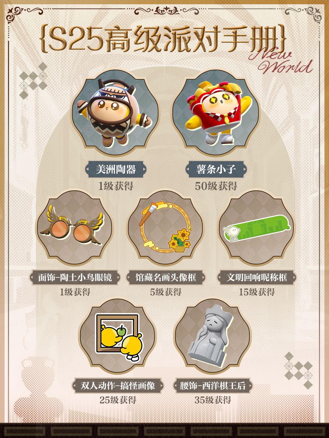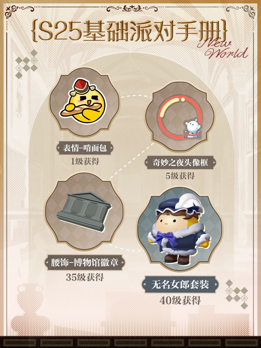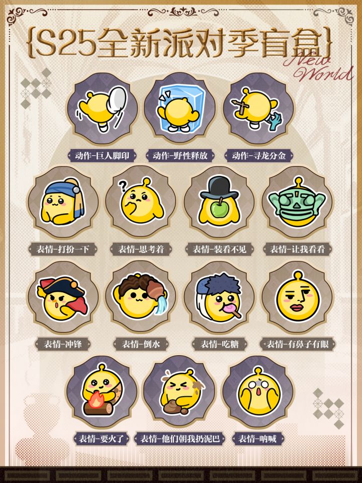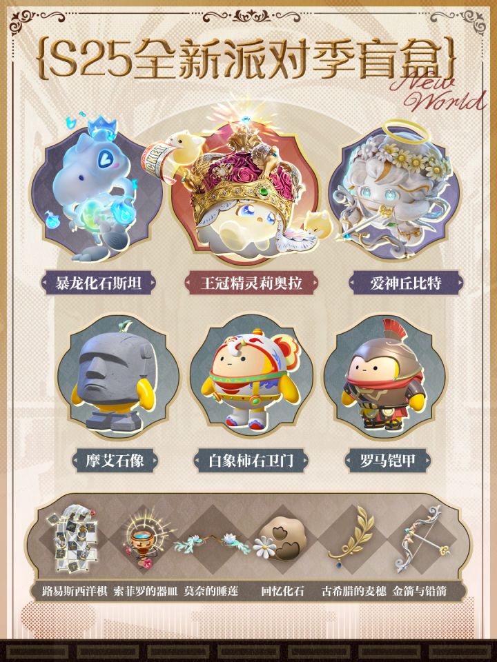 8月1日(本周五)S25博物馆狂想季开启,派对季盲盒、手册奖励和蛋位任务全面更新,多款外观、配饰和动作表情上新! 快来查阅图片,一起了解更多详情~