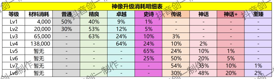 下图为1-4级神像耗材量,总共需要消耗13.8w祈愿石可升4级神像,后续消耗有数据再更新出来