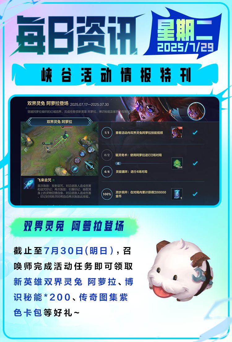 奖励:新英雄双界灵兔 阿萝拉,传奇图集紫色卡包,博识秘能*200等好礼