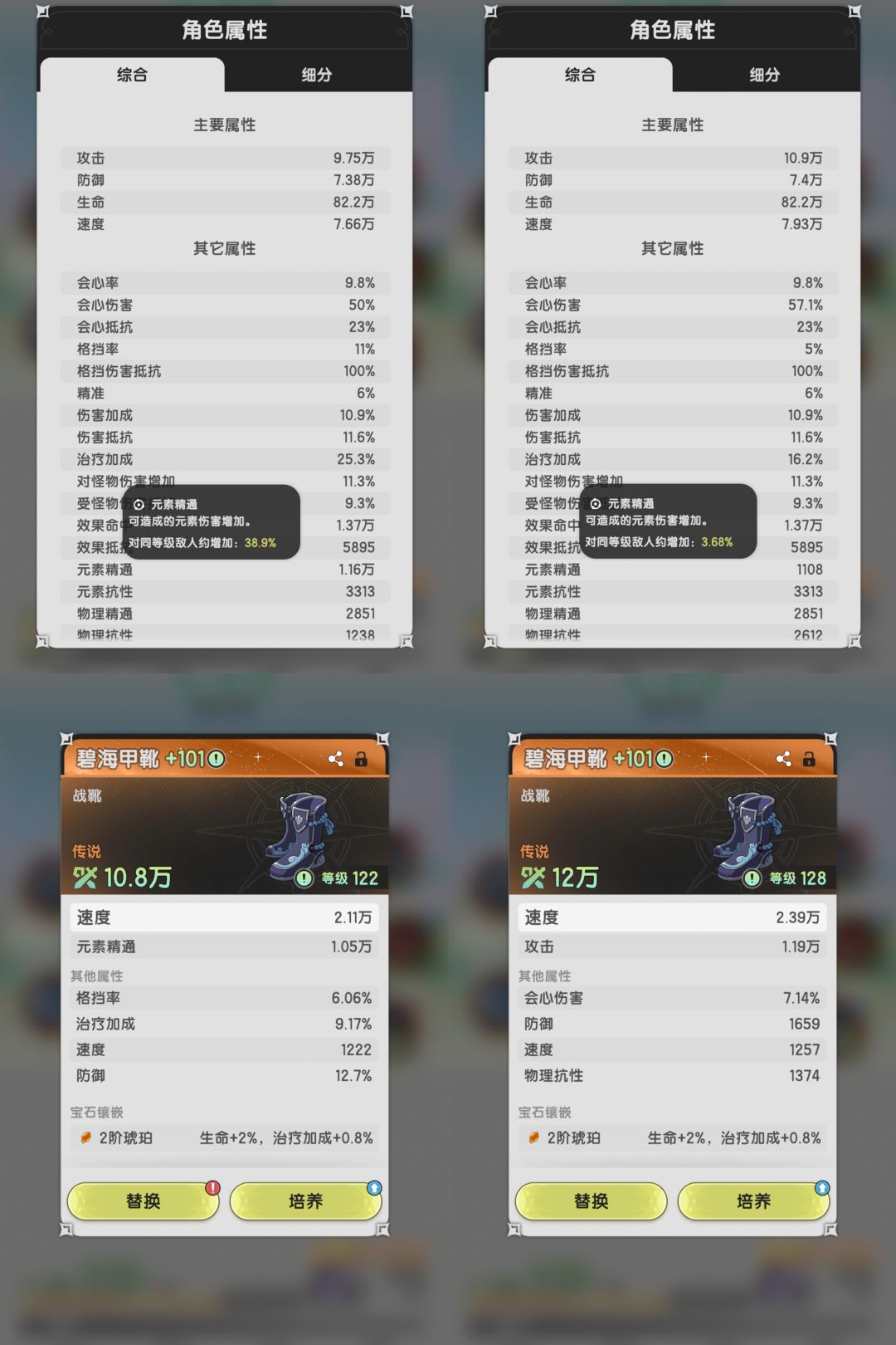 109级的号精通从1108提升到11600,加成从3.68%提升到38.9%。攻击力从10.9w下降到9.75w。