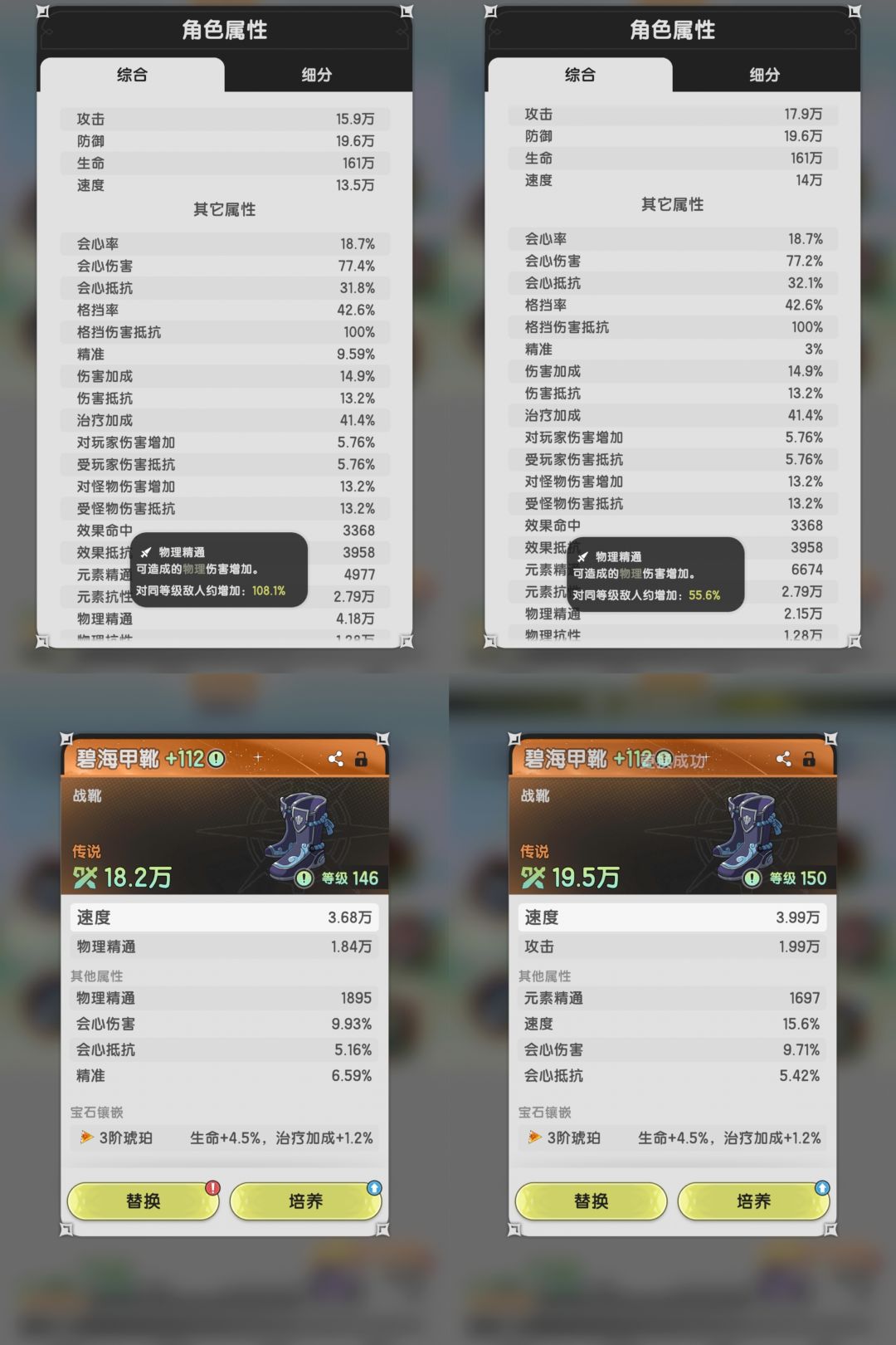 115级的号物理精通从2.15w提升至4.18w,加成从55.6%提升到108.1%,攻击从17.9w下降到15.9w。