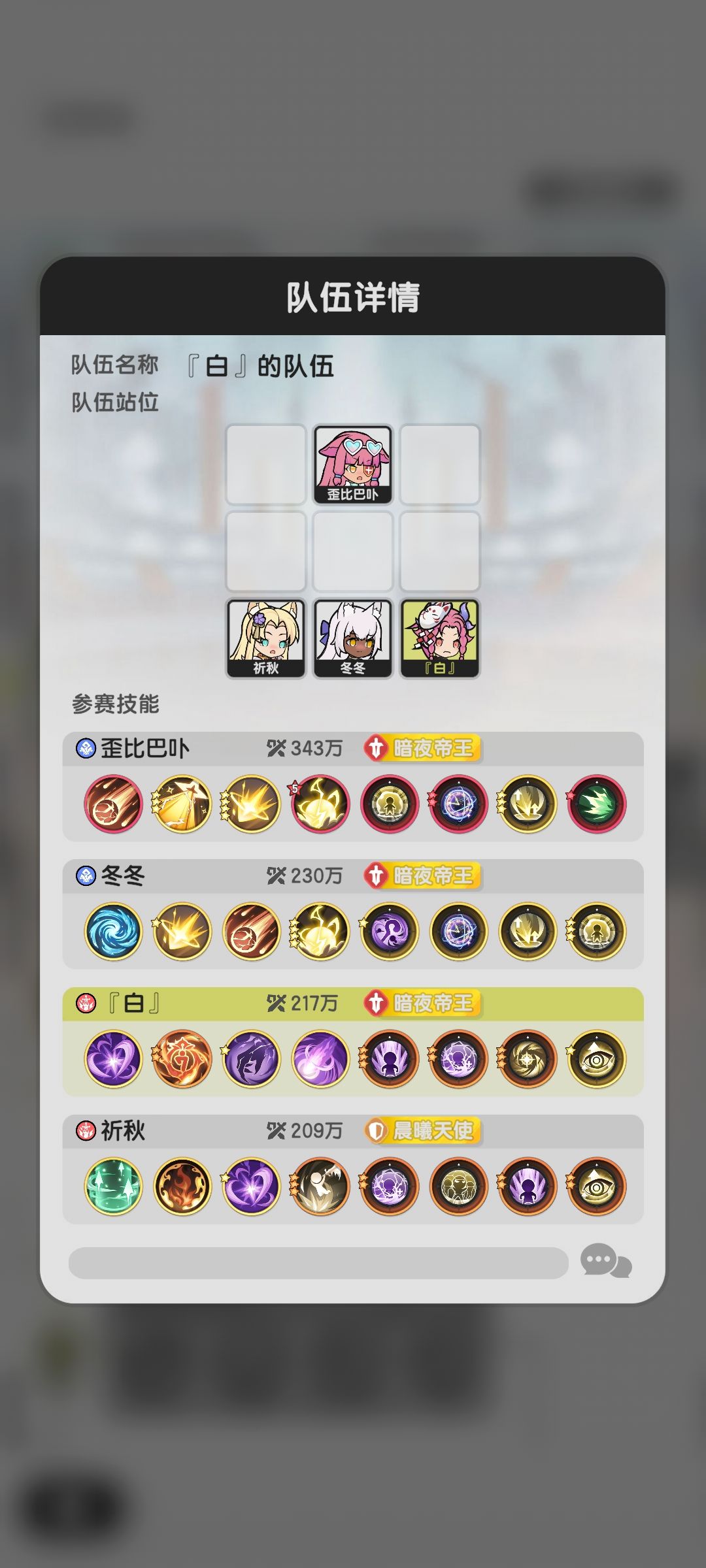 可以看到,我们这次组队赛只有一个大腿,而且整个队伍是2术2斗,没有骑士,可以说阵容非常差了。