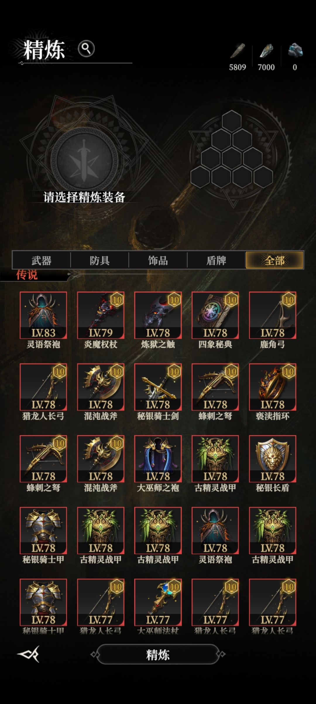 精炼。基本维持在70左右,没见过更高,最低有56。精炼石都是用在唯一装备的精炼上了,不然根本不够。