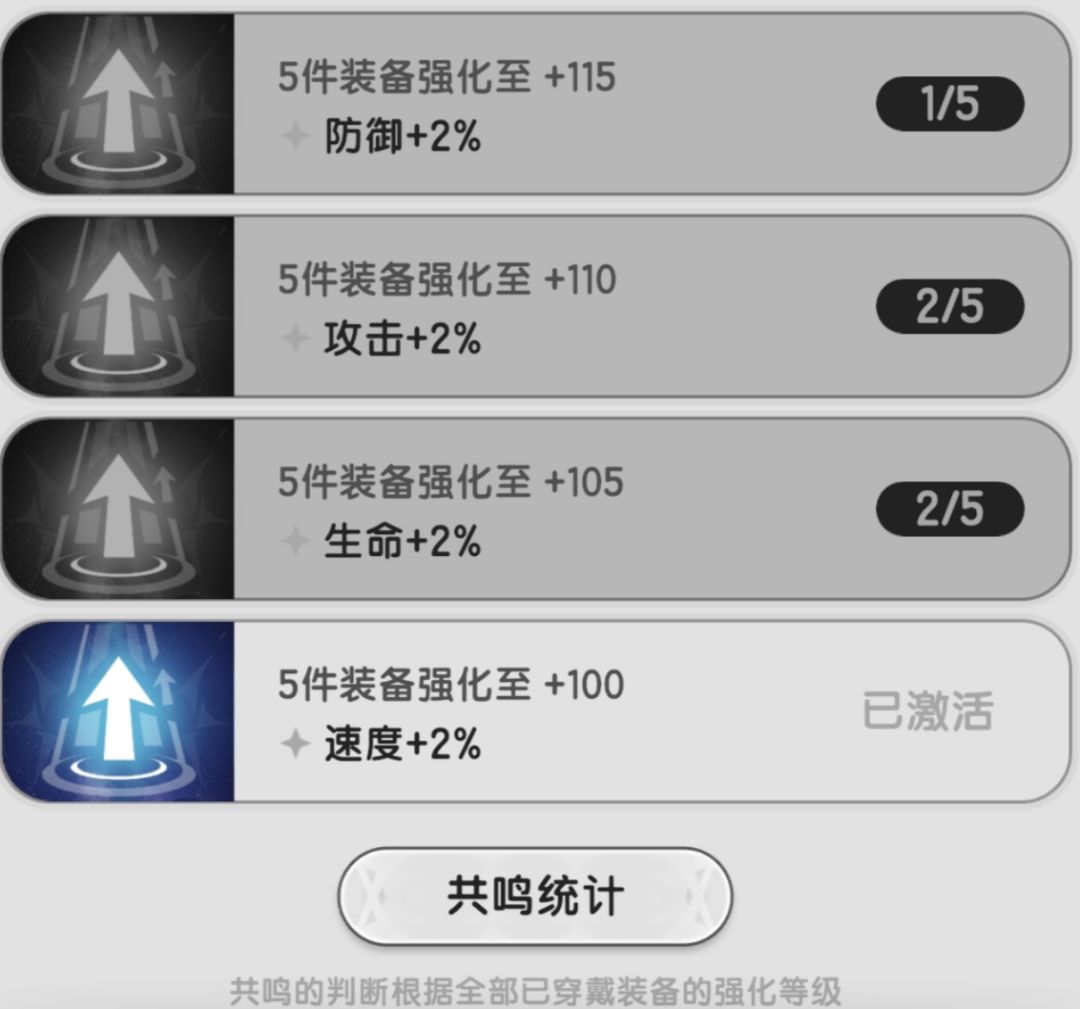 共鸣等级取决于所有部位的装备中最低级的强化等级,这个等级每提升5级时会解锁一级共鸣,依次为生命,攻击,防御,速度,均为2%的人物基础属性。