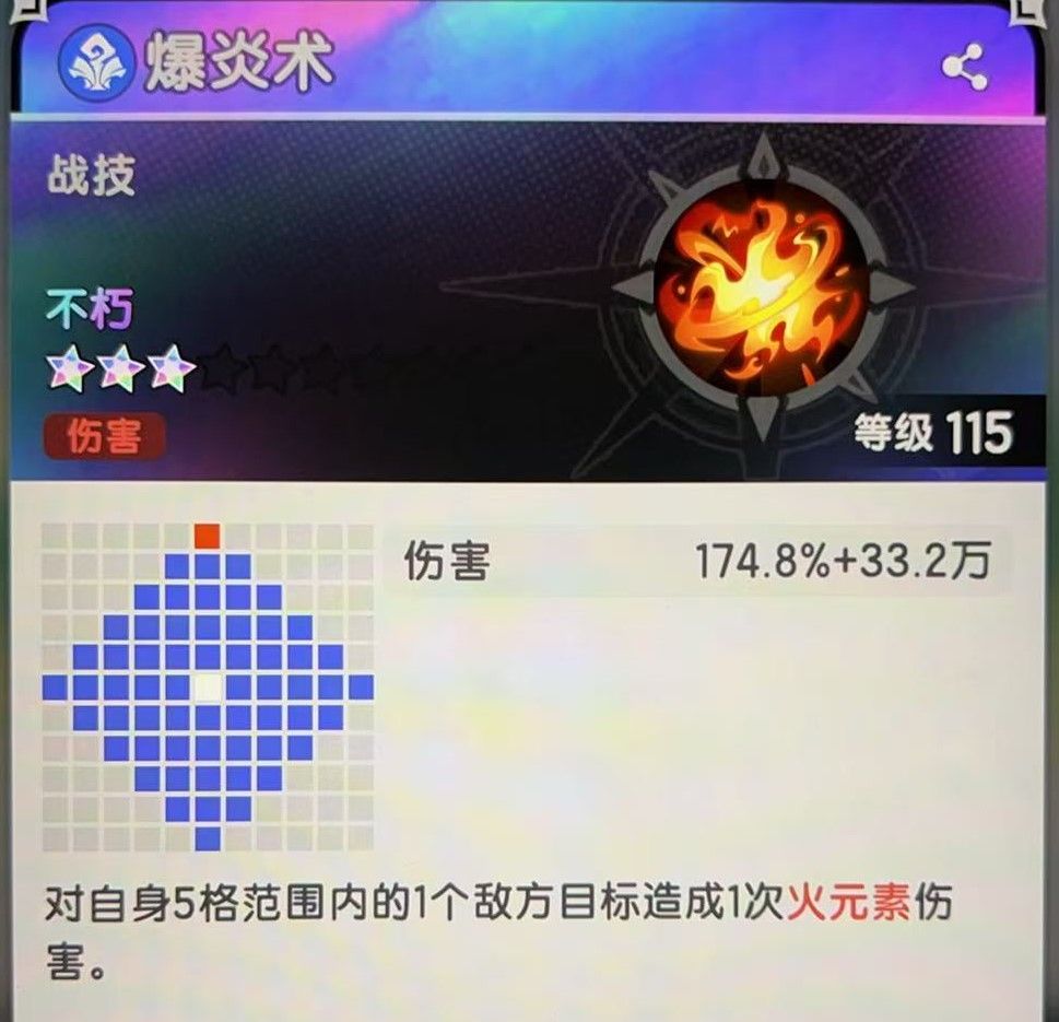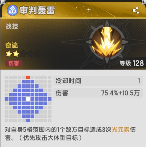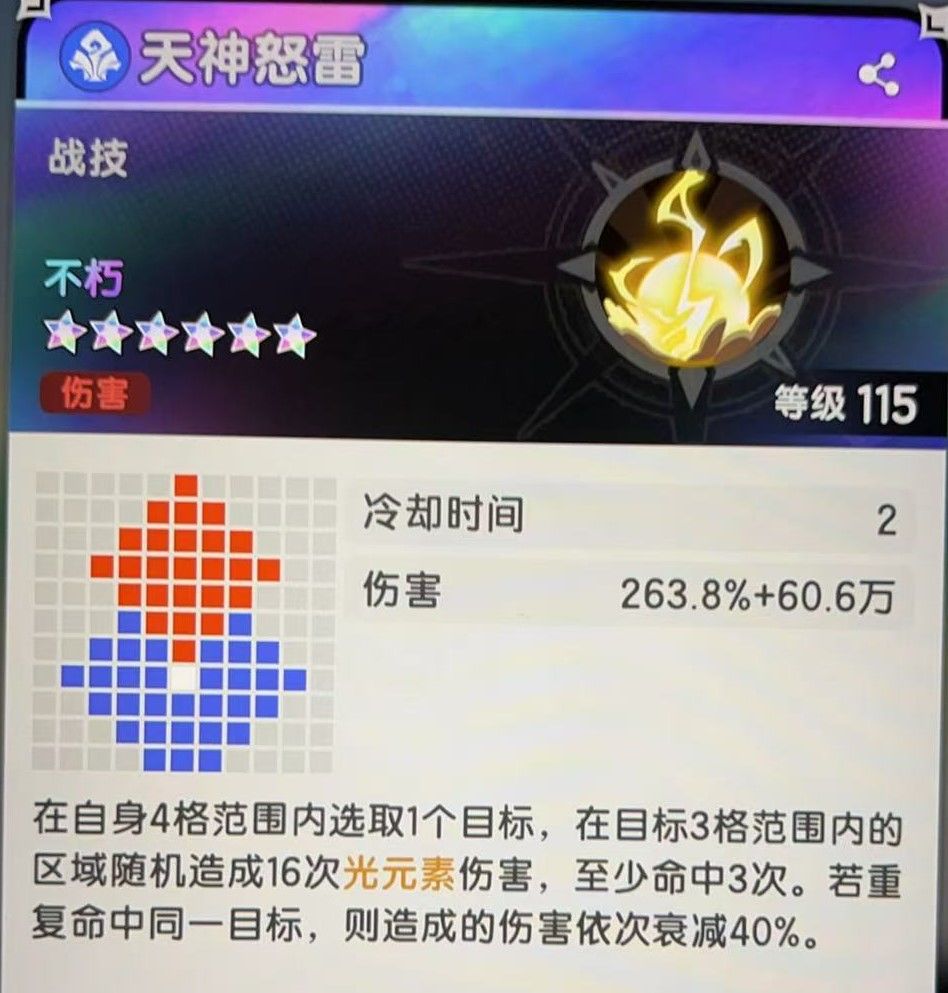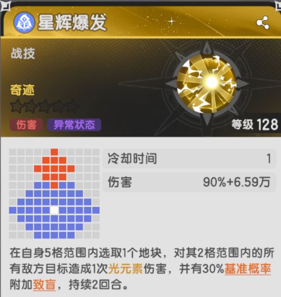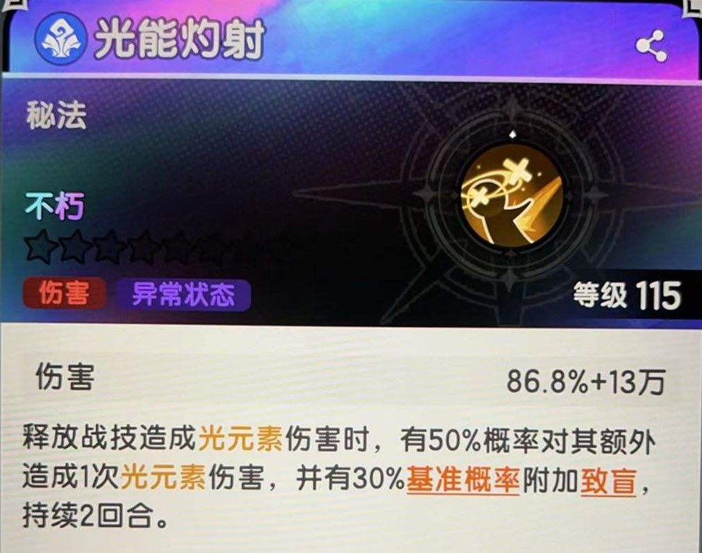 评价:4转的光属性战技之一,倍率较高,可以附加致盲,一般用于对策,如果冷却时间是0cd就是神技,然而并非。