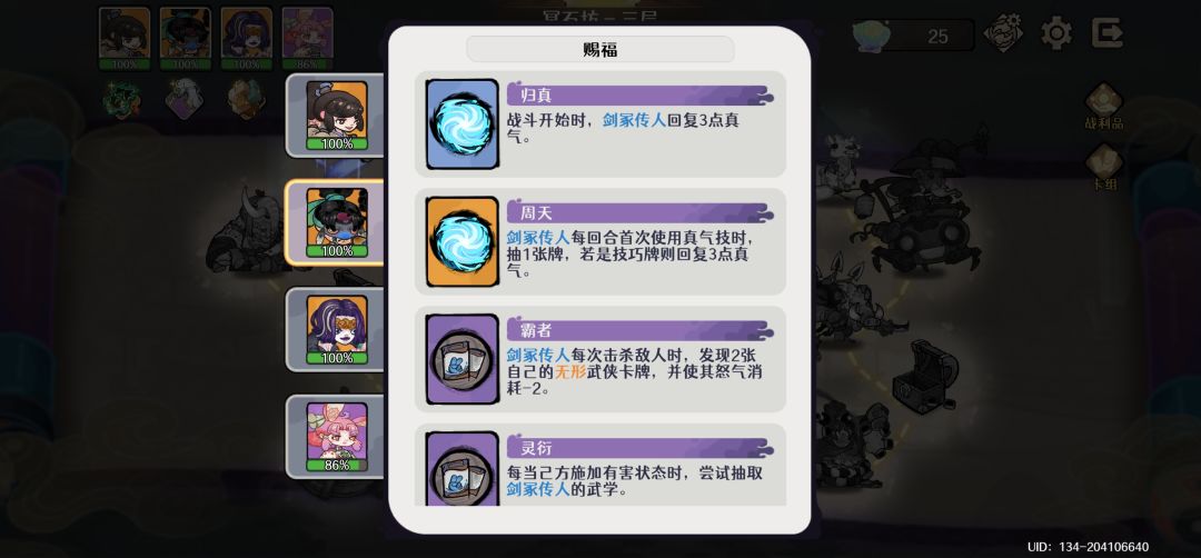 打法:刷到免费打出二费词条的卡:手上攒点二费卡就打,利用传人武学减费把风神腿和青云剑法费用砍到两费,再用免费打出去,牌库十二张牌,手牌上限十张,手里捏点抽牌牌词条稍微带点回怒或回真气,实现无限动,一般第一层牌没来的时候会有点刮但到第二层基本上就已经凑的差不多了,可以一回合无限刮死。传人真气技筋脉点到三级一次回六怒,二命一次回十二怒,所以最好满手牌开技能,能抽二命就抽二命,回怒是质变。