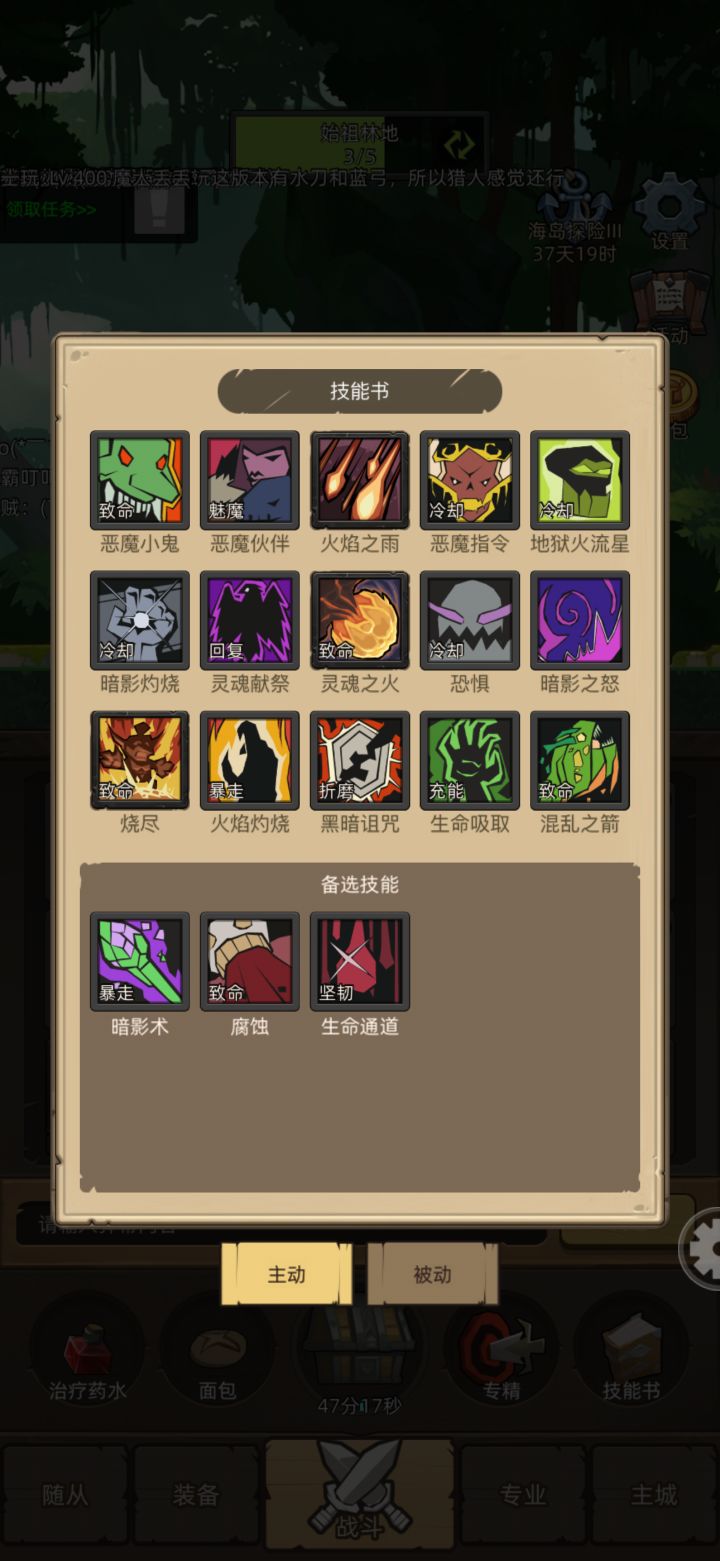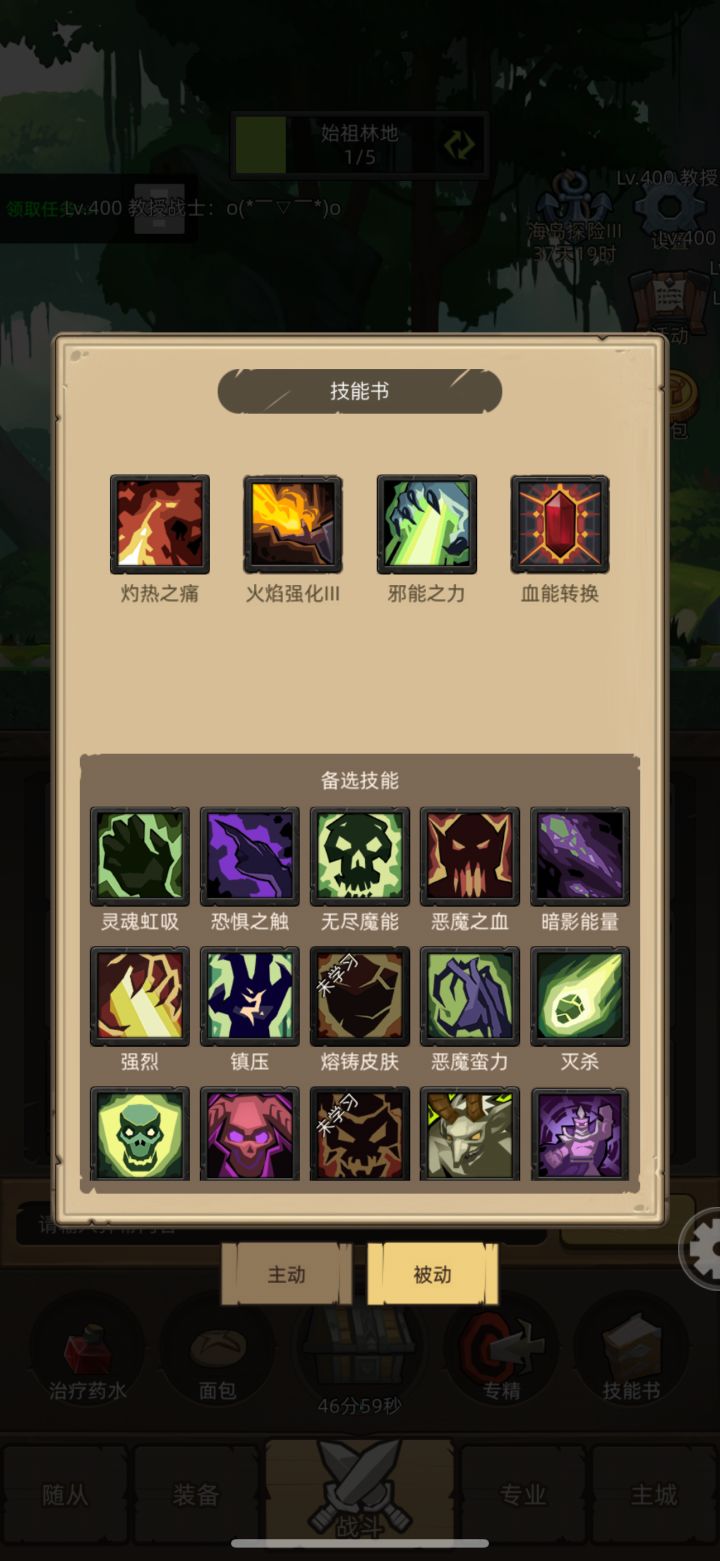 不推荐挂机 因为挂机我也没试过 技能就是图片里的技能 重点说下被动技能 就是血能转换一定带上 剩下三个一个加暴击率 一个火焰强化 一个加功强