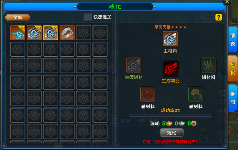 除了以上两种方式之外,成长首饰还可以通过物品炼化进行升级。除了必要的首饰装备,还需要添加必须辅材才可进行炼化。辅材还分为一般辅材和必须辅材,炼化非必定成功,加入的辅材越多成功率越高。但需要注意炼化失败后所有材料都会消失!