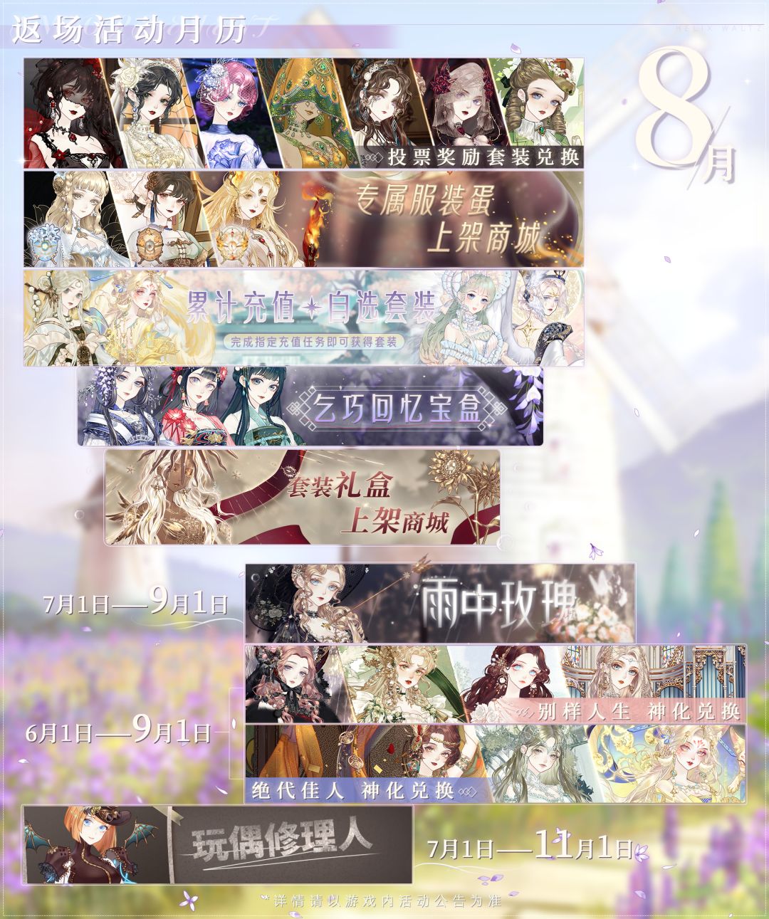 8月1日6:00-9月1日5:59,商城限时上架投票奖励套装对应的专属道具礼包。