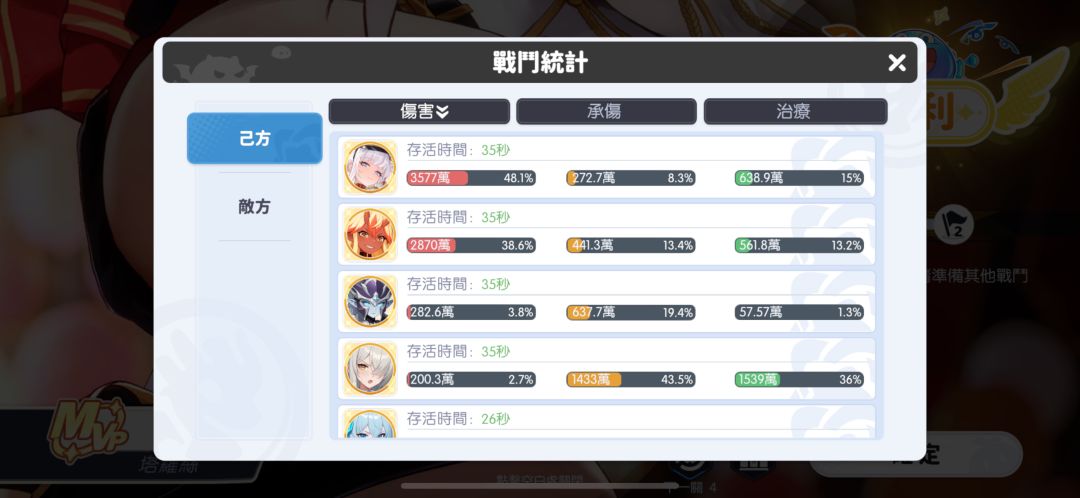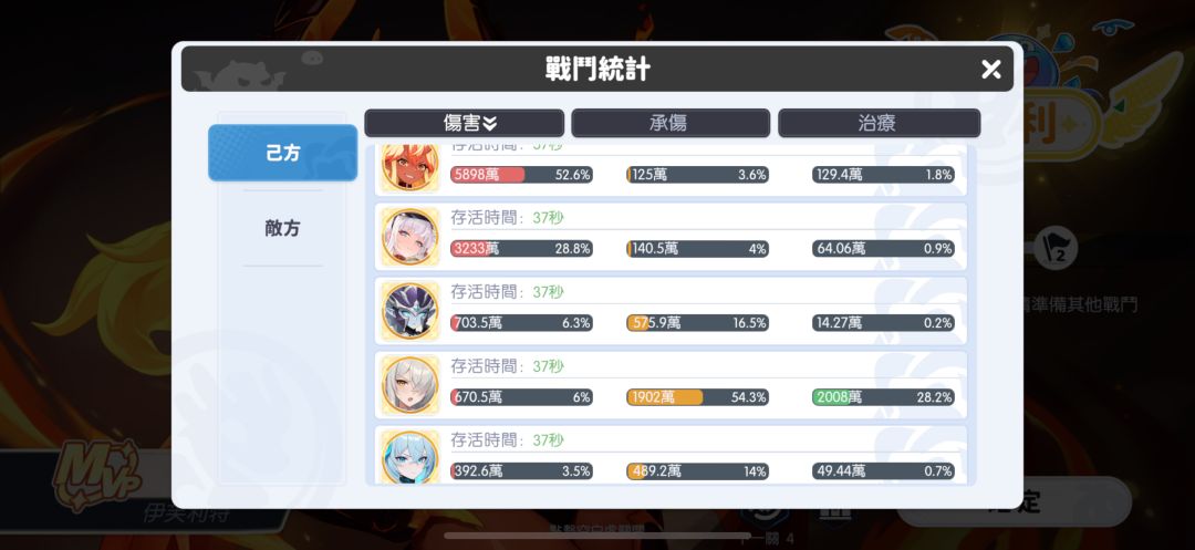 生存方面:由于是前排需要考虑生存,但实际测试下来,发现生存意外的不错。如果配合海神+女王/炎魔打出蒸发降低敌方命中,再加上自身的闪避加成,该角色闪避率很高。即使没有钻(没有闪避加成),也有不错的坦度。
