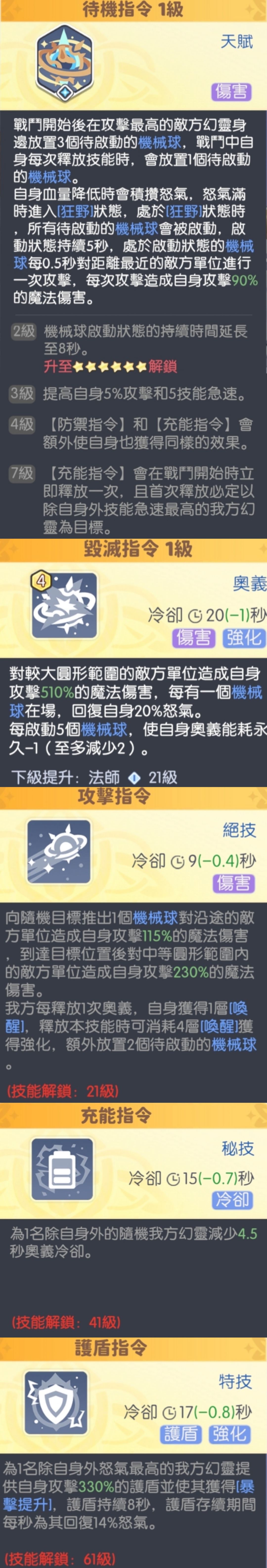 〇机械球并非召唤物。机械球最多存在六个。待启动机械球可以存在20秒。机械球攻击距离最近的敌人,开局的三个机械球会集火敌方攻击力最高的角色。机械球可以暴击。