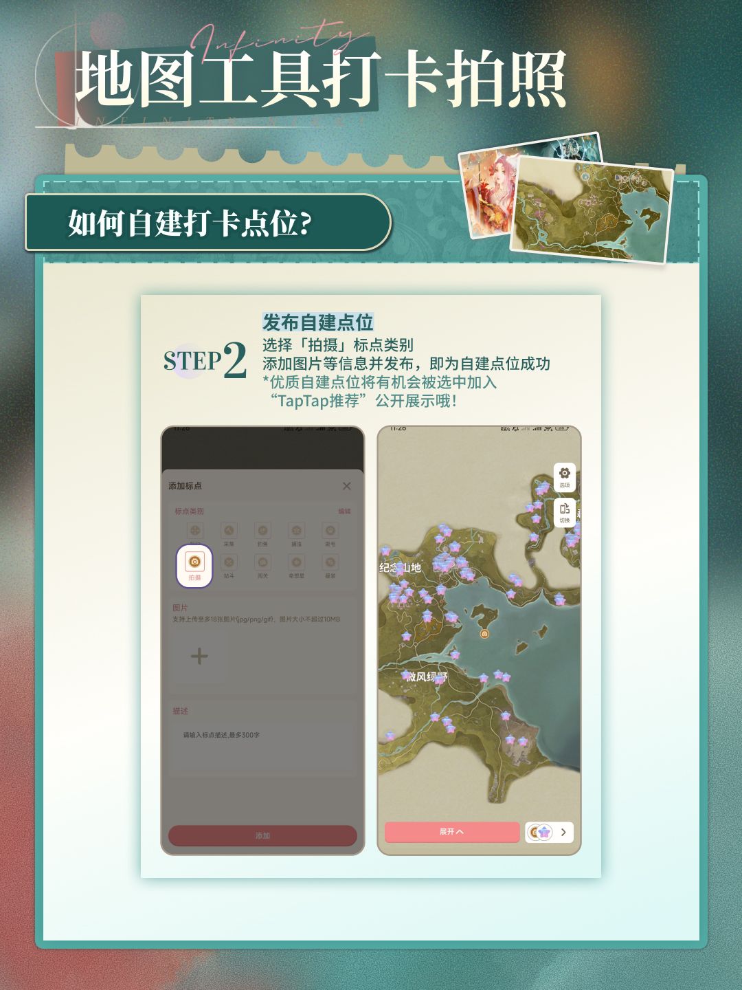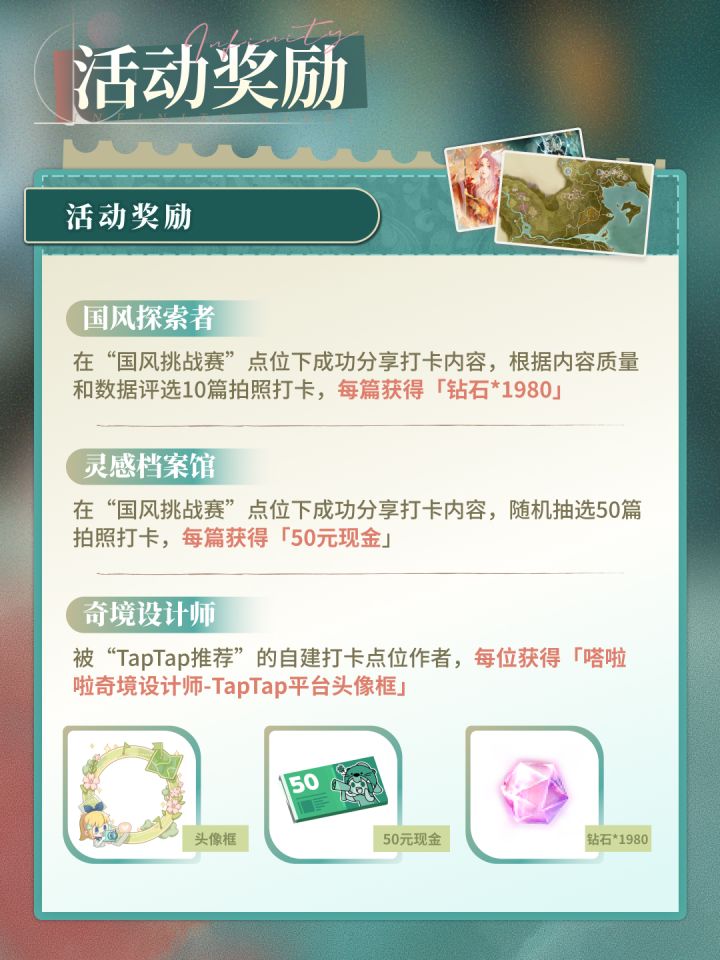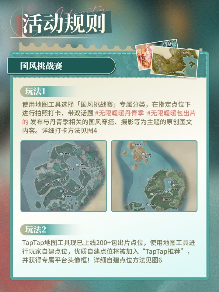 TapTap地图工具现已上线20个“国风挑战赛”官方打卡点位,更有200+“TapTap推荐”包出片点位待你解锁,快来参与地图拍照打卡吧