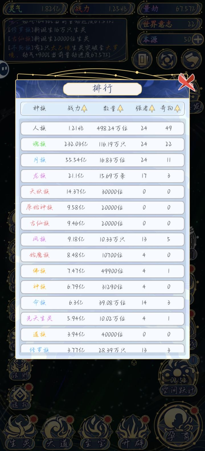 4小时速通战力,开局养2族就行了,两个种族资源会很集中,战力会提的很快然后拿世界碎片前期可以把福地那些加灵力的拉满,前期本源要屯,世界意志全部拿来进阶,不要点法则,卡等级无所谓。因为下一阶段的资源会帮你升级的更快一直等到升到中千世界的时候就是战力起飞的时候,拿本源来点气运,战力直接飙飞后面就已经可以开始我不吃牛肉了,我先养的人,魂两族,前期资源是刚刚好够的