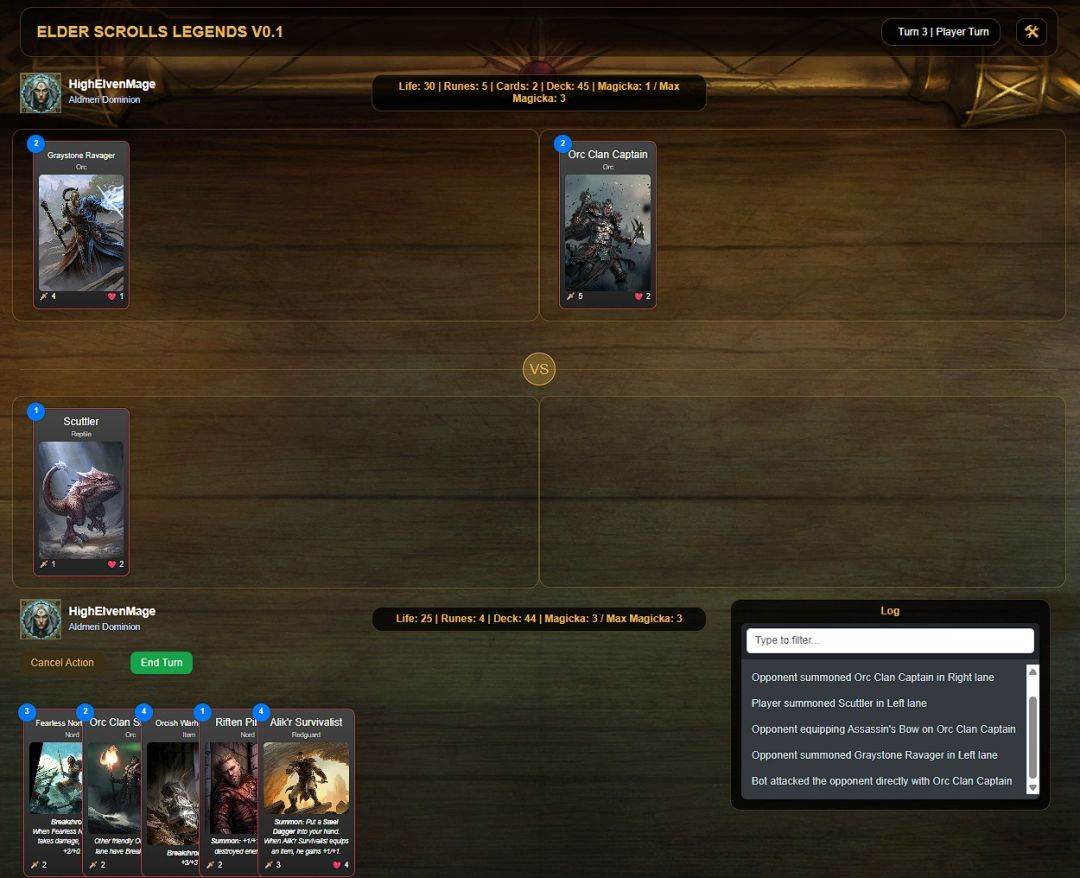 一位名为julien的玩家在Reddit论坛上发布了自己正在进行的“网页版《上古卷轴:传奇》 ”的计划,目前已更新到V0.4版本,生命、符文数量、手牌数量、卡组数量、剩余法力值、法力值上限信息都在屏幕中间通过文字显示,右下角log显示牌局历史信息,大部分卡牌的都能在合法的法力值消耗下,通过简单的拖动实现游戏中的效果。目前只能用预设的红蓝大卡池和AI进行对战,未来也许可以开发出更多功能,值得期待。