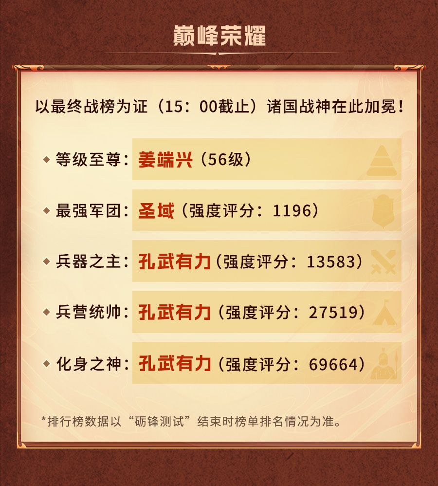 烽火将再燃,霸业待君续!本次的数据回顾就到这里,再次感谢各位主君的大力支持~砺锋测试不是终点,而是新战场的起点!相信下一次相遇,必是更辽阔的战场、更酣畅的征伐!
