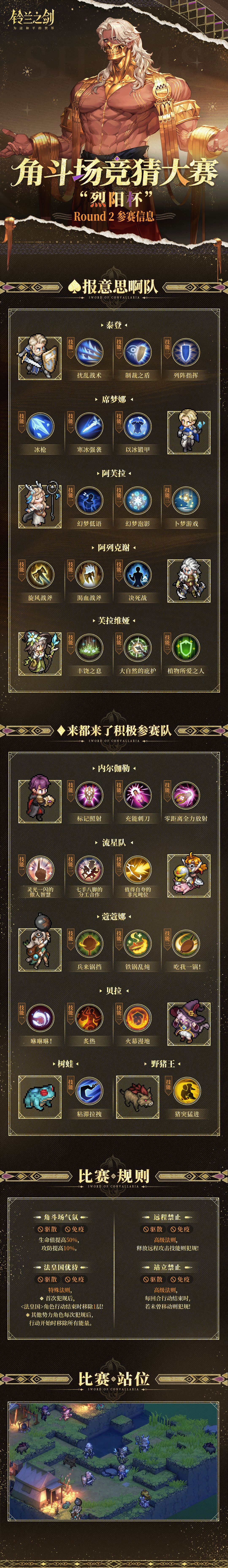 3. 每轮常规比赛竞猜开始时将会提供该轮比赛规则及战队的技能、站位信息,团长需要参与投票并在评论区留言自己看好的队伍,竞猜正确有机会获得丰富的周边奖励。比赛结果将在竞猜次日18:00以战斗录屏的形式公布。