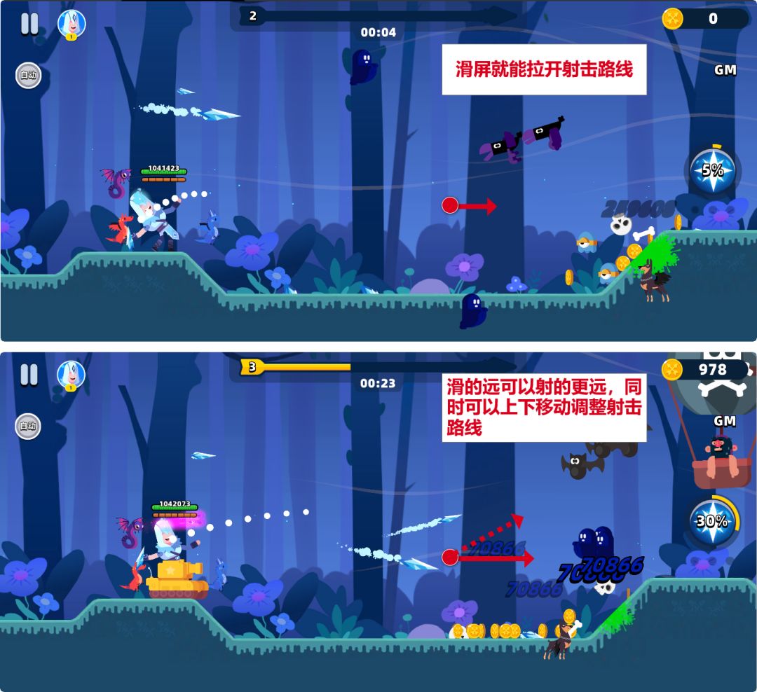 只需滑动瞄准-松手射击!箭矢会沿抛物线飞行,可上下滑动调整路线。解锁长按技能后,长按可蓄力获得额外攻击效果。