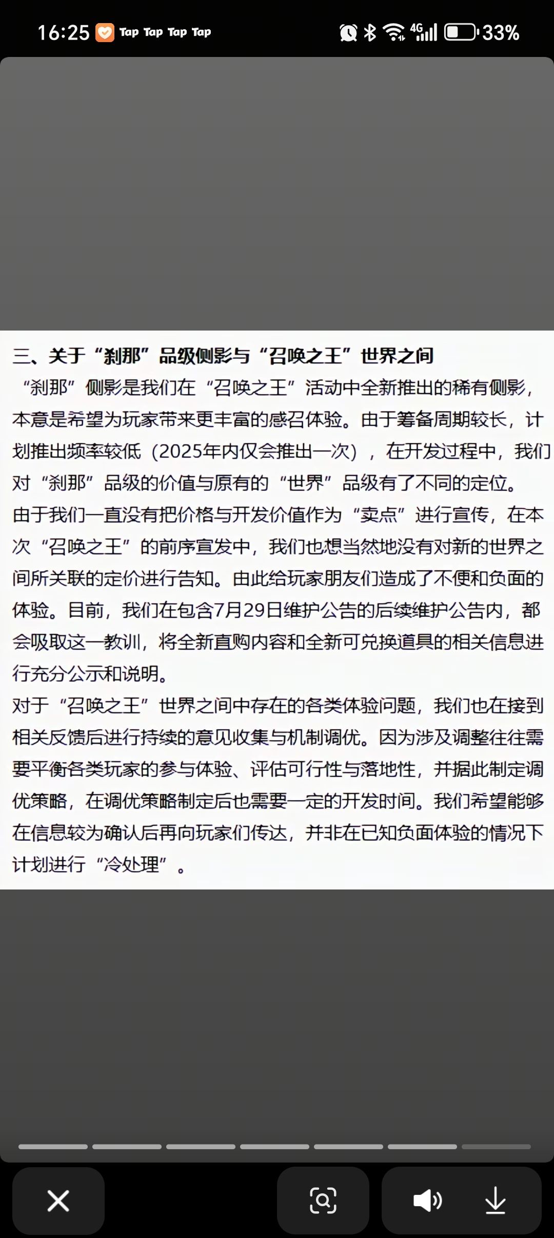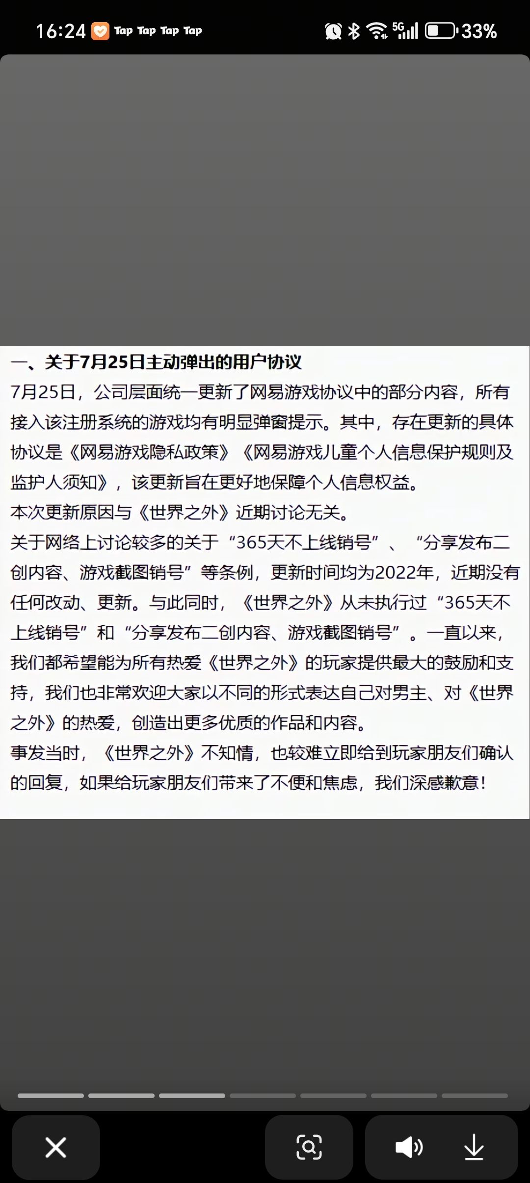 。玩家们在游戏中投入了大量的时间、精力和感情,对卡池价格这类关键信息有着知情权,官方这种想赚钱的行为实在是有点那啥了。再看 7 月 25 日主动弹出的用户协议事件。公司层面更新网易游戏协议部分内容,虽说更新旨在保障个人信息权益,且和《世界之外》近期讨论无关,还强调像“365 天不上线销号”“分享发布二创内容、游戏截图销号”等条例近期没改动,游戏也未执行过这些条例。但事发当时,游戏方没能及时给玩家确切回复,导致玩家们陷入焦虑和不安。在信息传播迅速的网络时代,玩家对于自身权益相关的消息极为敏感,官方这种信息沟通的不及时,进一步加剧了玩家对游戏运营的不信任感。