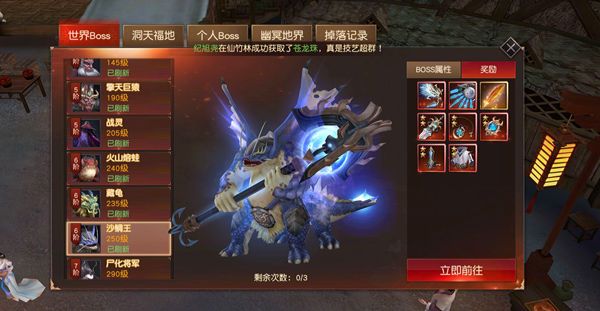 洞天福地Boss洞天福地分为两层,boss等级不同,掉落的奖励也不同,可供玩家自由选择。注意等级过高,击杀低级boss是无掉落的,毕竟虐菜真的很没意思。