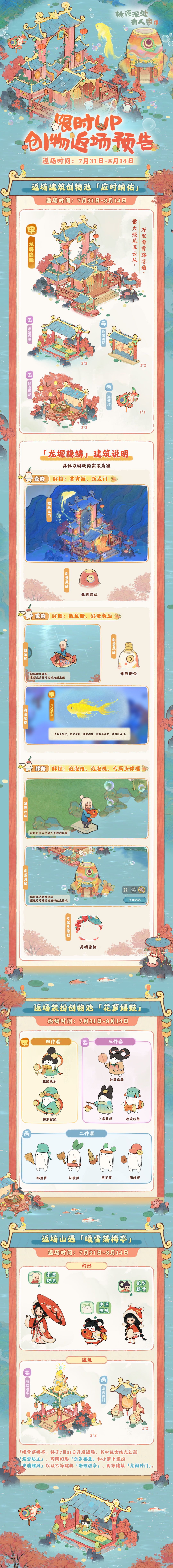 本期限时UP建筑创物池将会返场甲等建筑「龙墀隐鳞」。该建筑不仅能解锁鲤跃龙门动画,还能解锁水上出行工具「鲤鱼船」,更有专属头像框「丹梅雪旆」、互动道具「游鲤吐珠」期待大家探索!若能一登龙门、化身为金鲤,还有多款彩蛋建筑期待山民们发现。