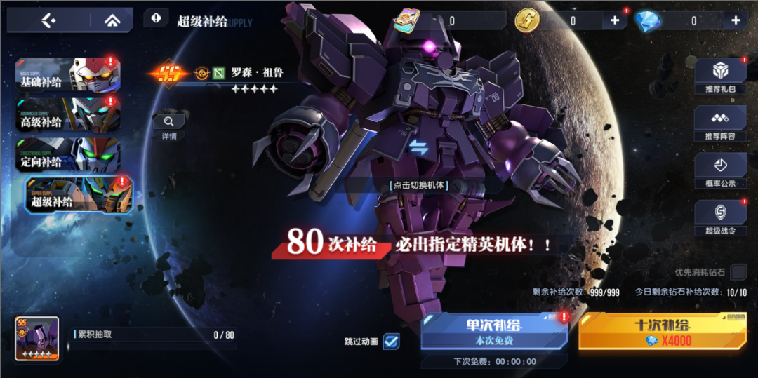 在6月26日【限时新机】中登场过的机体罗森·祖鲁,将于7月31日0点加入【超级补给】自选机体列表,开服天数≥43天的服务器的指挥官可进行抽取。