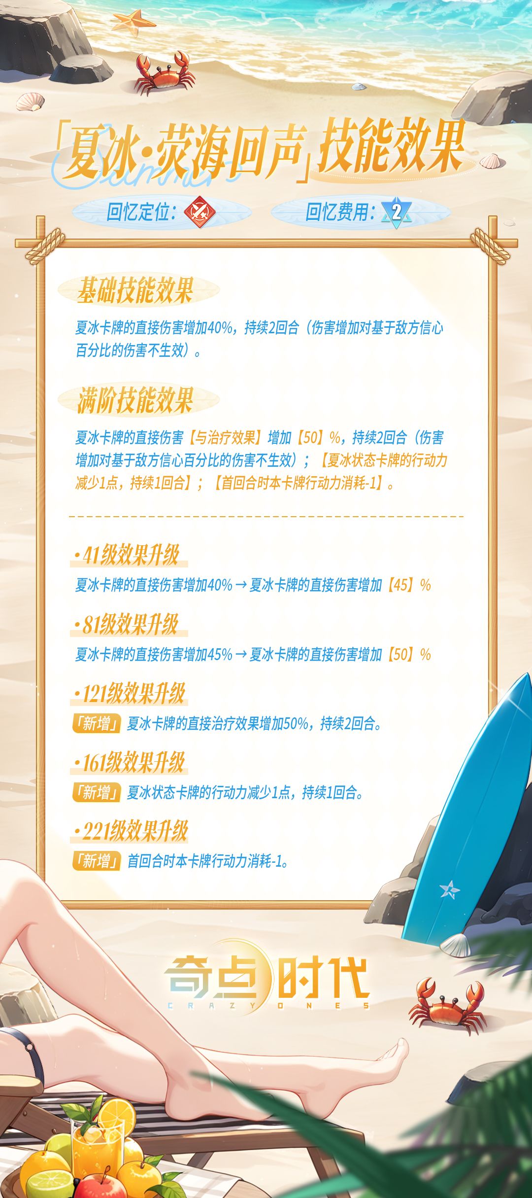 夏冰卡的直接伤害和治疗效果提升50%,两回合。回合内,夏冰卡消耗-1。首回合释放为1费。