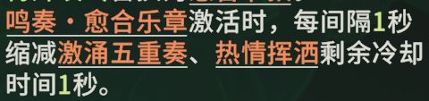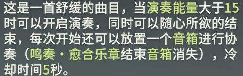 鸣奏·愈合乐章:核心技能。除了治疗端的强化外,其特点是会在面前放置音箱,能复读角色释放的技能。配合强化版激涌五重奏或者强化版大招都有很高的收益。有天赋后需要尽可能丢BOSS脚底或者怪堆中,能配合热情挥洒打出成吨伤害。