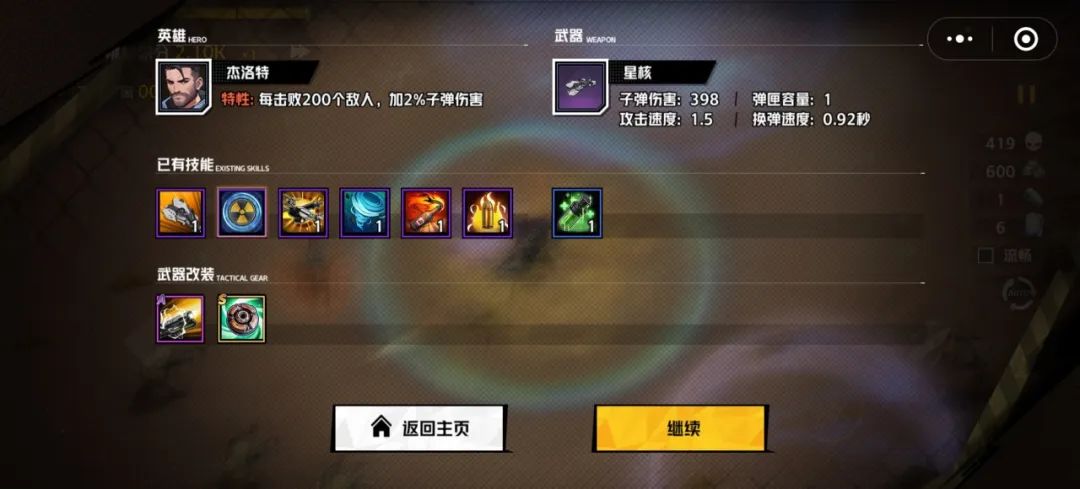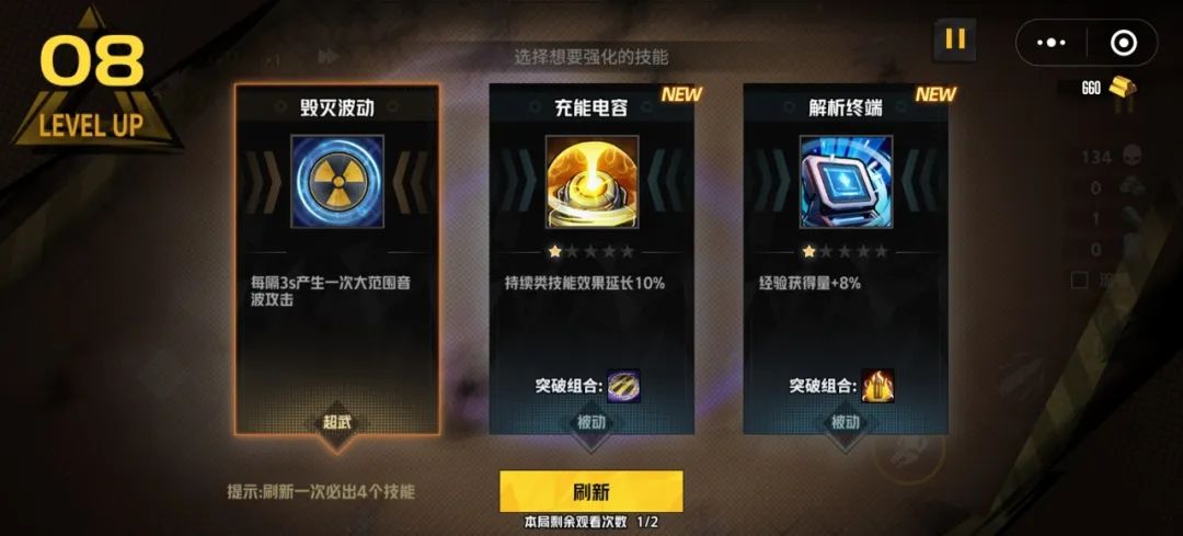 PS:由于技能选择较多,局内共6个主动技能位,6个被动技能位。所以在前期选择技能时尽量优先学习重要技能。关卡战斗时由于有时长限制,并非每种技能都能升级为超武,因此前期技能选择尤为重要。无尽挑战虽然没有时长限制,但是同样只能各选择6个技能,选择主动技能后一定要记得选择对应的被动技能,否则无法升级为超武