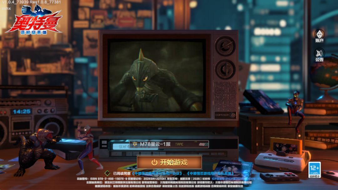 我们直接进入游戏,创建账号,选择M78星云-1服,游戏进入界面是非常怀旧的游戏机在播放奥特曼动画,有一种回到小时候在电视机前观看奥特曼的感觉,直接点击开始游戏