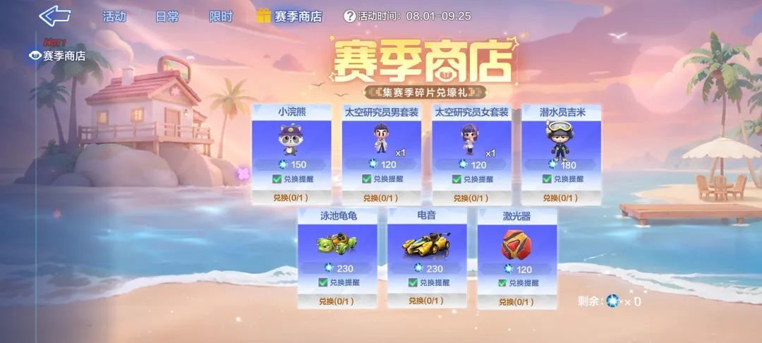 长风破浪,日照沧海,流动的海风拂过这个夏天,如同当年,又带来新生的气息。8月1日,新一期赛季商店正式开启,全新传说道具车【泳池龟龟】上架,太空研究员套装、潜水员吉米、小浣熊……品类丰富,多款经典道具返场,参与完成整个赛季历程内各大任务即可获取赛季碎片免费兑换自己喜爱的道具噢~