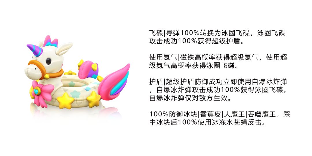 泳圈飞碟:需要瞄准后释放,目标被命中后减速,在手中的随机一个道具转换为冰块。