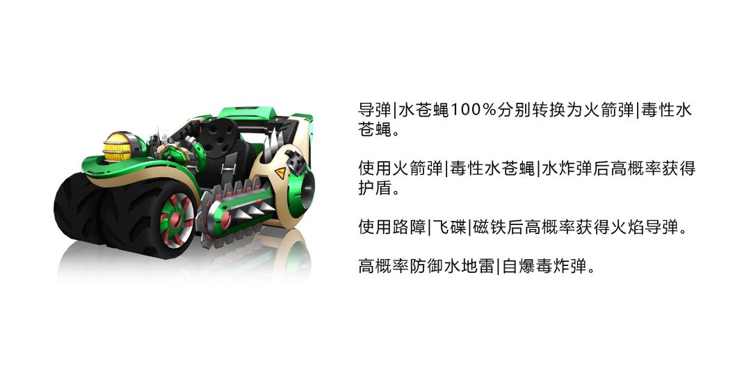 为了安全请一定要带上泳圈啊!尤其是前面超速行驶的目标们,独角兽泳圈可以将飞碟/导弹转化为泳圈飞碟,并干扰指定目标行动。更有超级氮气、自爆冰炸弹联动泳圈飞碟,核心道具源源不断,强大的防御和反击机制也使其在赛场上如鱼得水,肆意遨游。