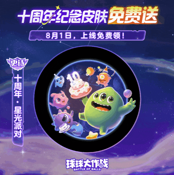十周年纪念皮肤套装免费送!8月1日,上线领「十周年・星光派对」