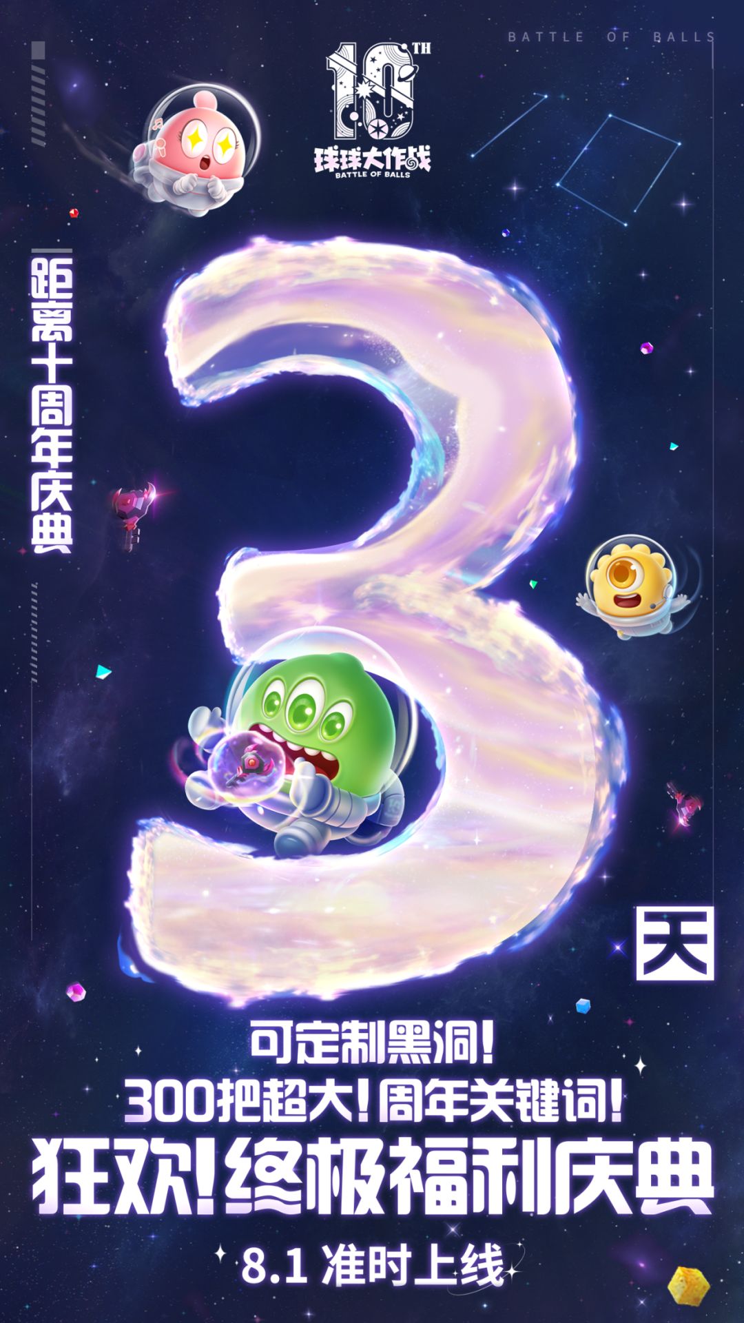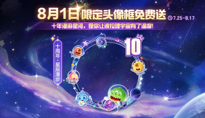 现在!立刻!马上!定好闹钟提醒我们奔向球球十岁生日!8月1日,让我们在波拉哩共赴十周年庆典!十周年纪念皮肤套装和头像框,是我们在时光里反复打磨的纪念,将送给每一个准时赴约的球宝!
