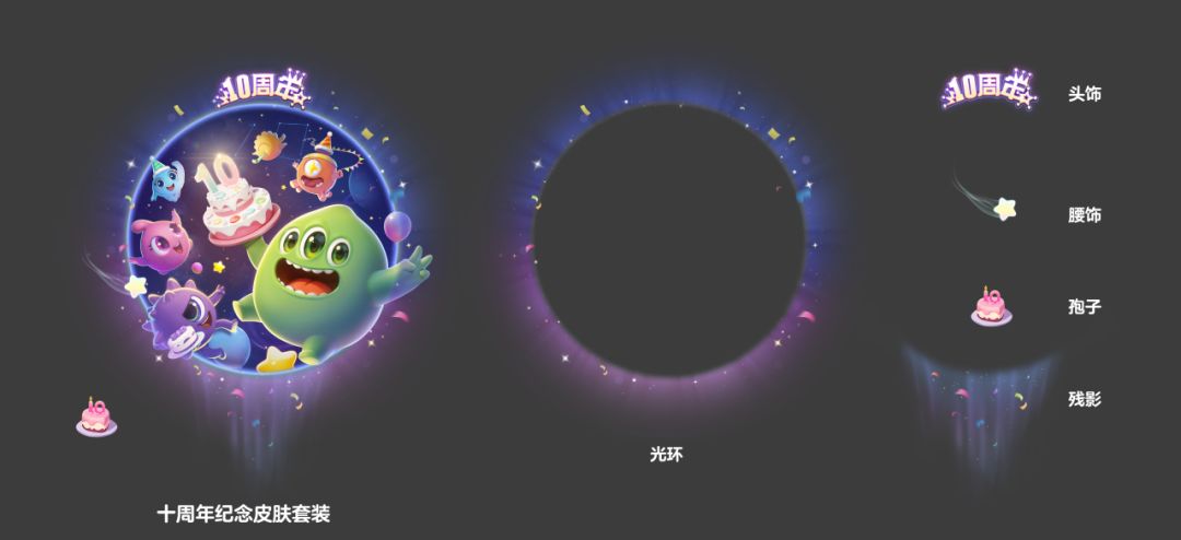 孢子「十周年・美味蛋糕」 裹着奶油纹路,把整个周年庆典都甜香萦绕!残影「十周年・喜悦痕迹」 拖着流光,每一次移动都留下星星点点的欢庆轨迹!头饰「十周年・生日发卡」 别在头顶,轻轻晃动时像在为这场周年庆典欢呼!腰饰「十周年・许愿星」 悬着星星吊坠,仿佛藏着球宝们十年间的每一个小小心愿!光环「十周年・欢庆聚会」 圈着热闹,旋转起来就像一场永不散场的狂欢!