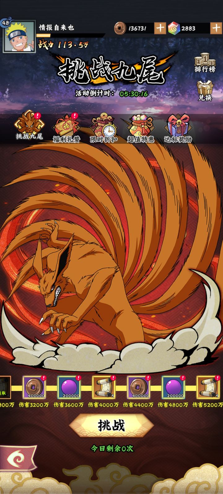 九尾挑战:奖励全拿 白3我爱罗比白4三船伤害高
