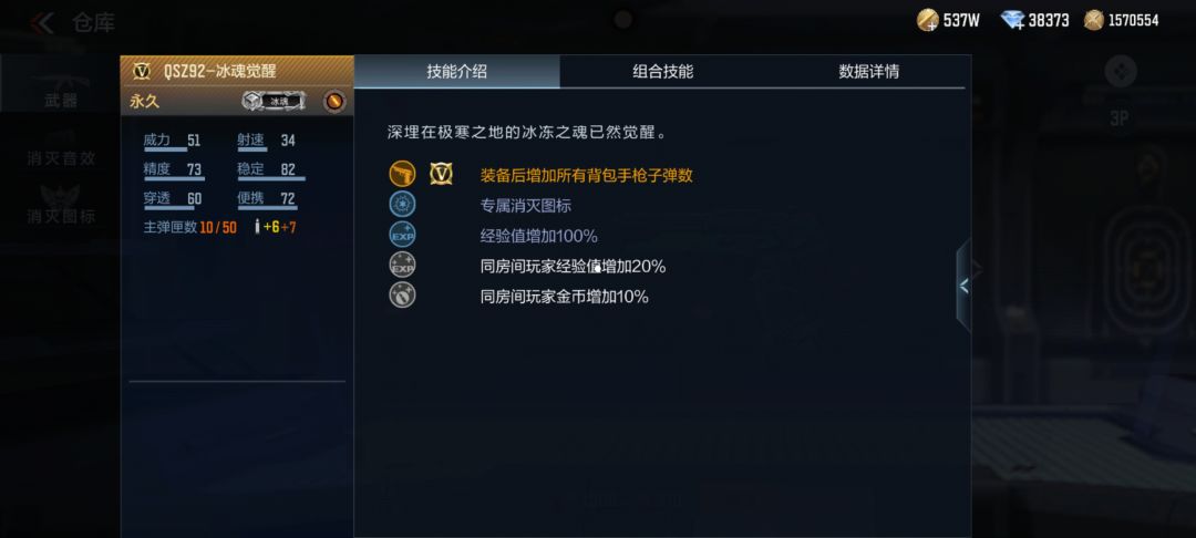 QSZ92-冰魂觉醒只需要玩家在S3赏金令中等级达到200即可免费获取,在技能方面有装备后增加所有背包子弹数,同时拥有专属消灭图标。同时可以和AK47-冰魂觉醒、匕首-冰魂觉醒组成套装,套装加成为主弹匣子弹数+2。