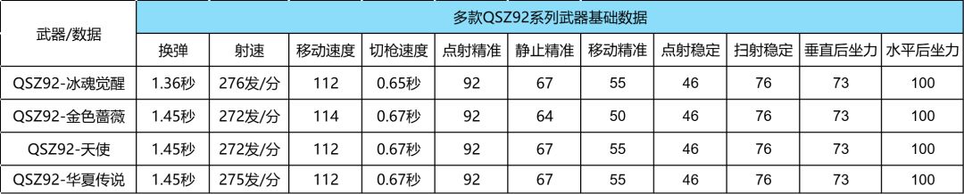 我们可以看到QSZ92-冰魂觉醒在基础数据表现方面,换弹速度方面是明显有所提升的,同时在切枪速度方面也是略微有所提升的。而在武器精准度方面,几把武器整体差距并没有太明显,而且QSZ92-冰魂觉醒在射速方面也是得到了强化。