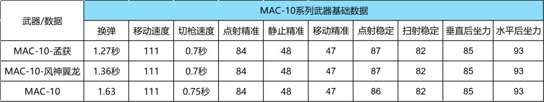 与同类型的MAC-10-风神翼龙进行数据对比后发现在换弹速度方面MAC-10-孟获是遥遥领先的,并且这也是游戏里上架的第二款MAC-10系列的英雄级武器。