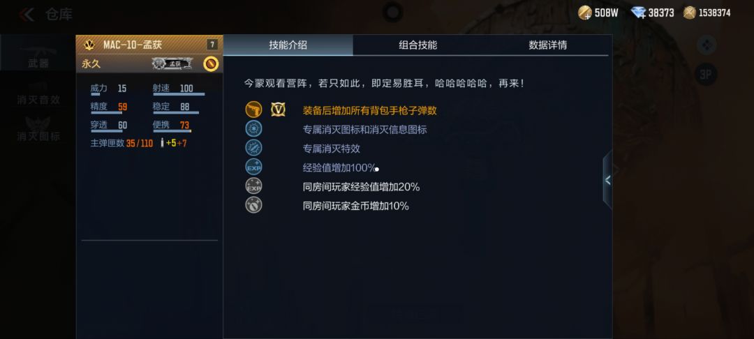 MAC-10-孟获只需要玩家赏金令等级达到400级即可以免费领取,在技能方面,有装备后增加所有背包手枪子弹数,同时拥有专属消灭图标和消灭信息图标,与KSG-孟获、蛮神巨斧组成套装后还可以获得主弹匣子弹数+2的加成