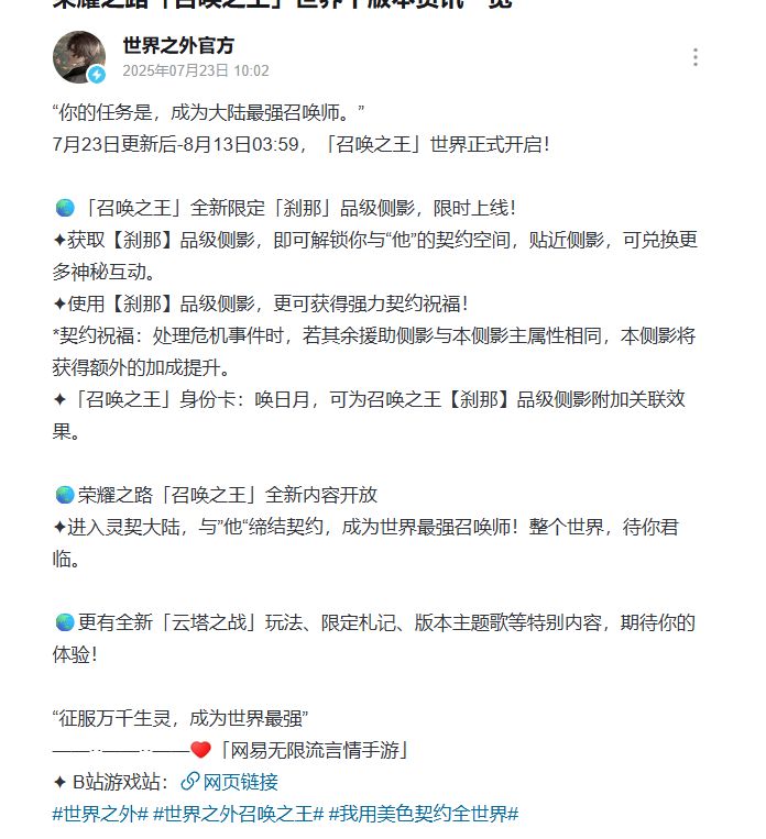 2025年7月23日,《世界之外》更新后,新卡池“召唤之王”的抽卡单价从300钻/抽涨至400钻/抽,涨幅达33%,且未提前公告。