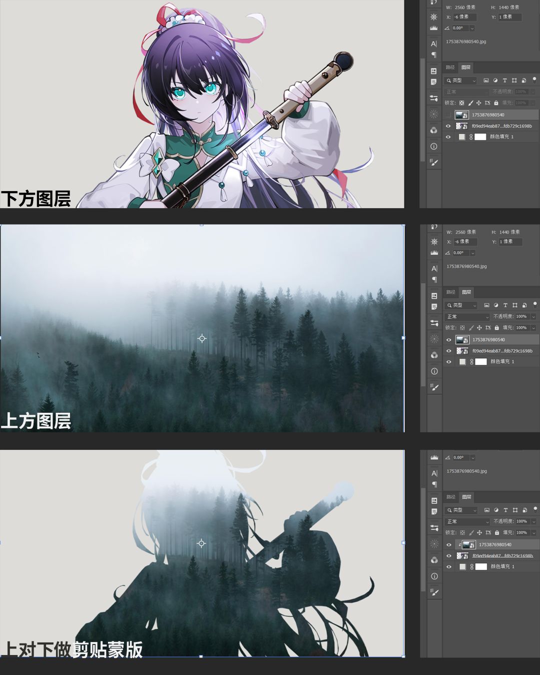 除此之外,上方图层的透明度会随着下方图层变化,下方图层的图层样式(双击图层打开的那些东西,如颜色叠加、投影等)会影响到两个图层,而滤镜则不会: