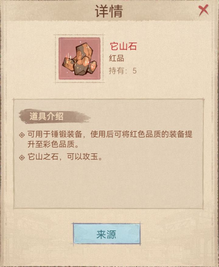 2️⃣他山石:装备锤炼彩装使用,锤炼后开启随机无双属性,平民玩家获取较难,使用时需谨慎。优先用于词条好的核心装备锤炼,洗练装备词条需要灵源液(白嫖难、难洗且看脸),彩装分解不返还他山石。