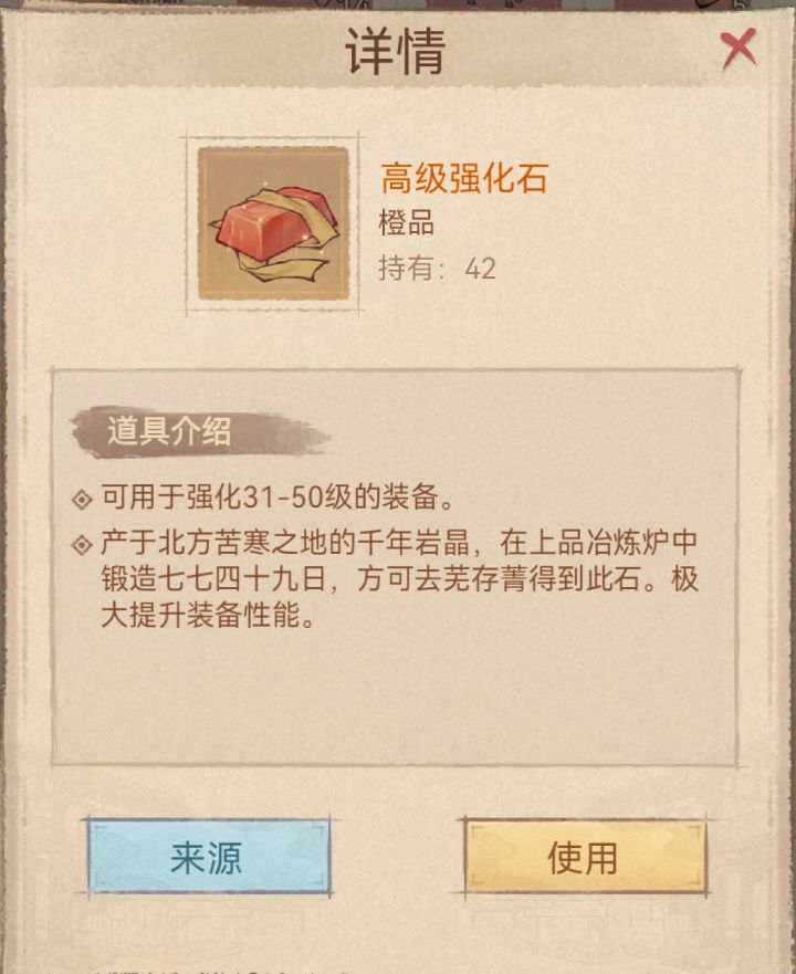 1️⃣高级强化石:用于31-50级的装备强化升级,对提升战力至关重要,且获取难度不低(商城每日礼包6r一个,绘卷商店25画卷10个,也可通过限时活动少量获取),建议囤积,避免随意浪费。重置31级以上的装备等级,高级强化石打八折返还。