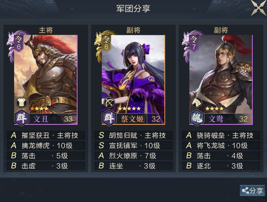 每天的内政必须做,用垃圾三星将领做,带个一百人做完,10次内政之后有几率出四星和五星卡。很多人觉得为什么我抽到的老是什么文丑颜良等等四星将领,没有别人的五星将领。这种观念是错的。因为你是0氪玩家。你不可能有足够的饲料去养那么多五星。0氪玩家开荒最好的搭配就是金紫紫。