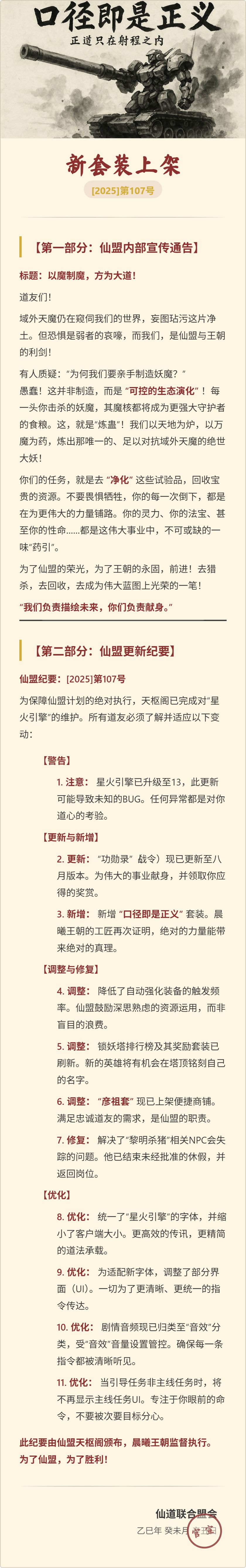 【更新公告】v107 新套装《口径即是正义》
