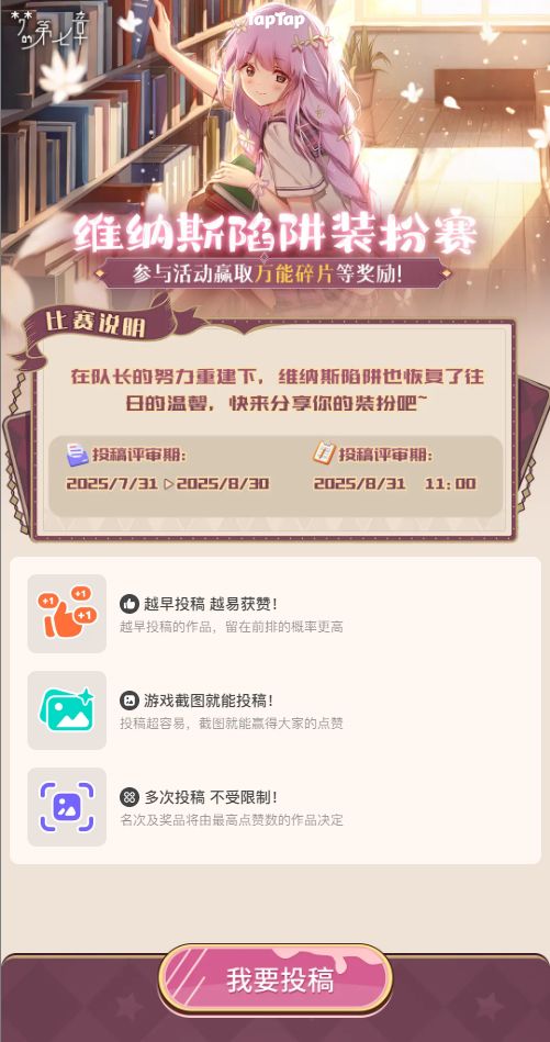 点击下方链接前往活动页,点击“我要投稿”即可参与活动;或活动期间,带活动话题“梦的第七章维纳斯陷阱装扮赛”发帖即可参与