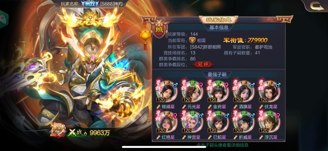 神灼:建议子嗣系统能出一个类似尚武堂一样的关乎个人成绩合并军团积分的,比如擂台战一样的玩法,分好多层次不同战力分别计算排名,给更多的不同战力的玩家的一个和相近战力较量的平台。子嗣系统的宝石只能合成不能一键无损拆解这点要补上短板。团友让我补充一点:九州铺路干脏活累活,玩家要给与一定战功奖励能调动更多玩家的积极性。
