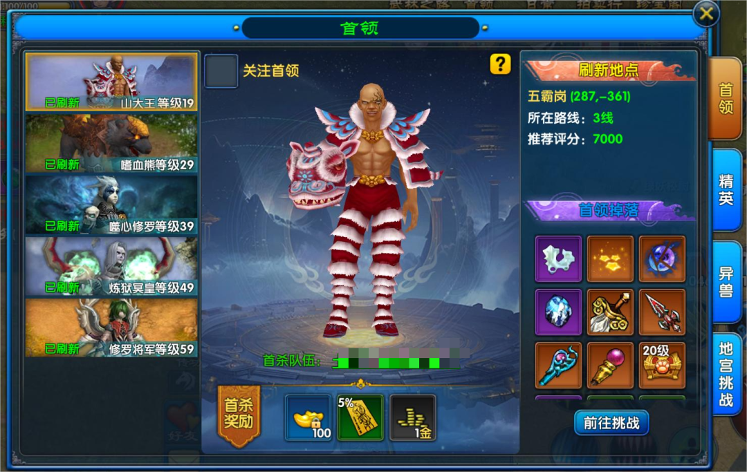挑战对应首领并击败即可获得对应奖励。完成首杀的队伍和玩家将获得首杀奖励,但玩家挑战等级不足首领挑战等级时,即使组队挑战也不计入首杀列表并且无法获得首杀奖励。击败首领可获得传说品质装备、首饰装备、传说装备材料等丰厚奖励。