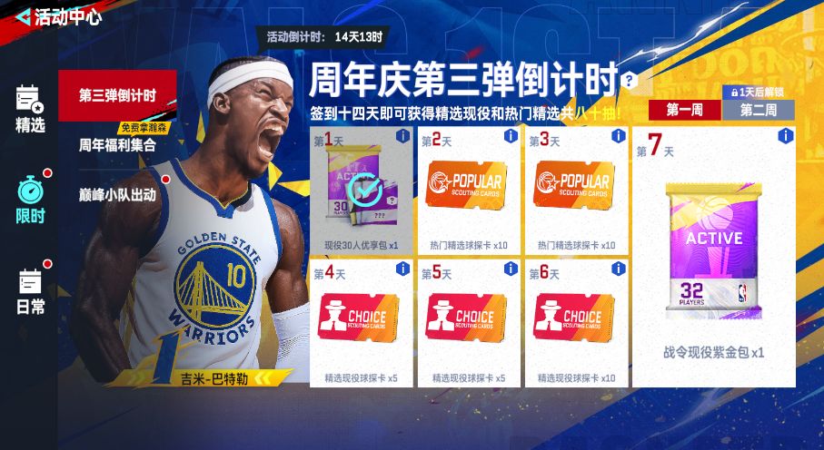 不过“第三弹倒计时”终于来点福利了,7月31日起累计签到14天,就可以拿到40+40球探卡,还有30人优享包+战令现役紫金包,xdm给我冲。